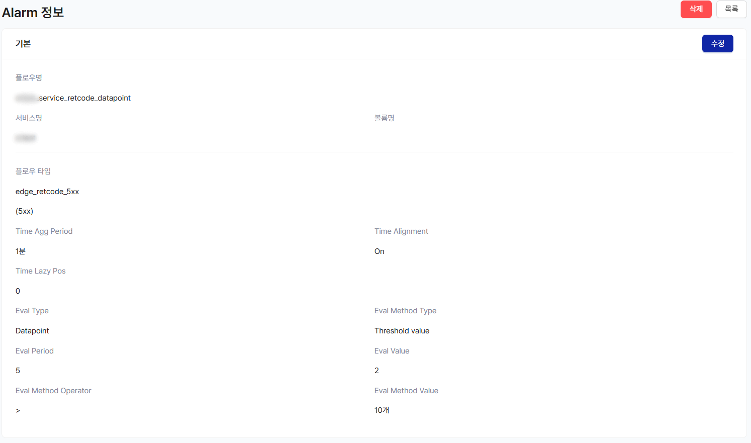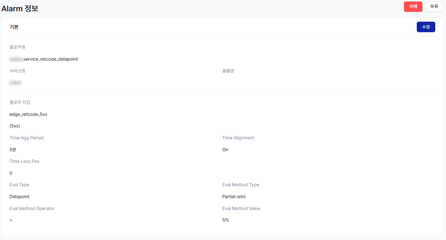 Edge Retcode 5xx를 5분간 Agg한 데이터를 평가 하며, 전체 응답 코드 중 5xx 비율이 5% 초과 하면 Alarm 발생
