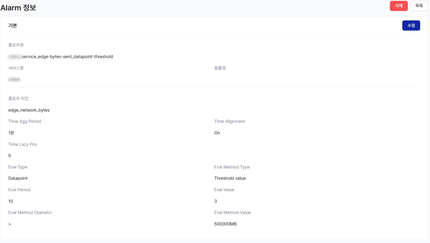 Network Bytes (전송량) 이 1분 동안 Agg된 값이 500G 초과이고 기준 시간으로부터 10분 동안 3회 이상 발생할 경우 Alarm 발생